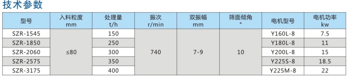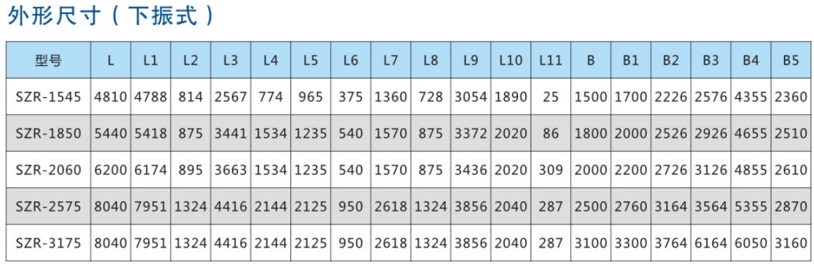 SZR系列热矿振动筛均为座式安装。采用双轴激振器,电机不参振;由两台电机外拖动激振器作反向自同步旋转,使筛体沿直线方向作周期性往复运动,从而达到筛分目的。
